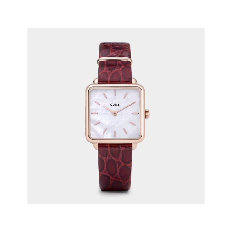 Contemporaine. Élégante. Unique. Avec leur boîtier carré aux angles arrondis, les montres de la collection La Tétragone jouent sur les lignes, les structures et les formes. Le cadran blanc sobre de cette montre s’associe à des finitions or rose et à un bracelet-montre rouge imprimé façon alligator, qui pimentera n'importe quel look. Comme pour tous les modèles de notre collection La Tétragone, le bracelet de cette montre est interchangeable avec n’importe quel autre bracelet-montre CLUSE de 16 mm.