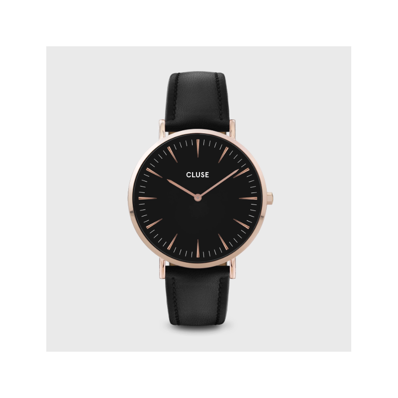 Audacieuse. Noire. Magnifique. Un éclat poudré associé à un baiser de minuit. L’essence de l’élégance moderne. La montre est présentée dans une pochette en similicuir gris. Cette montre peut, comme toutes les montres de la collection La Bohème, être facilement personnalisée avec n’importe quel bracelet à mailles ou en cuir La Bohème ou La Roche.