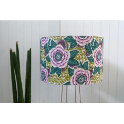 Abat-jour tambour tissu extérieur marine tissu intérieur jaune imprimé flleurs blanches et marines;