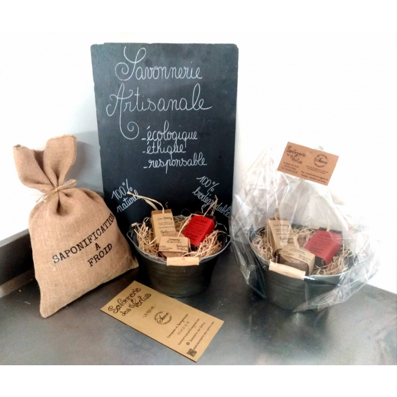 Dans le seau en zinc il y a du papier recyclé, de la frisure et les savons au dessus.