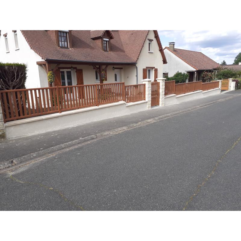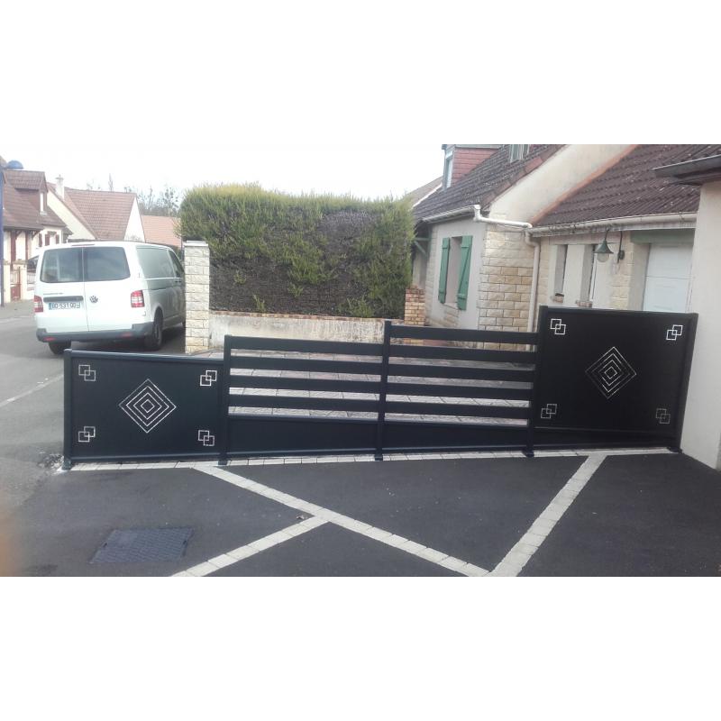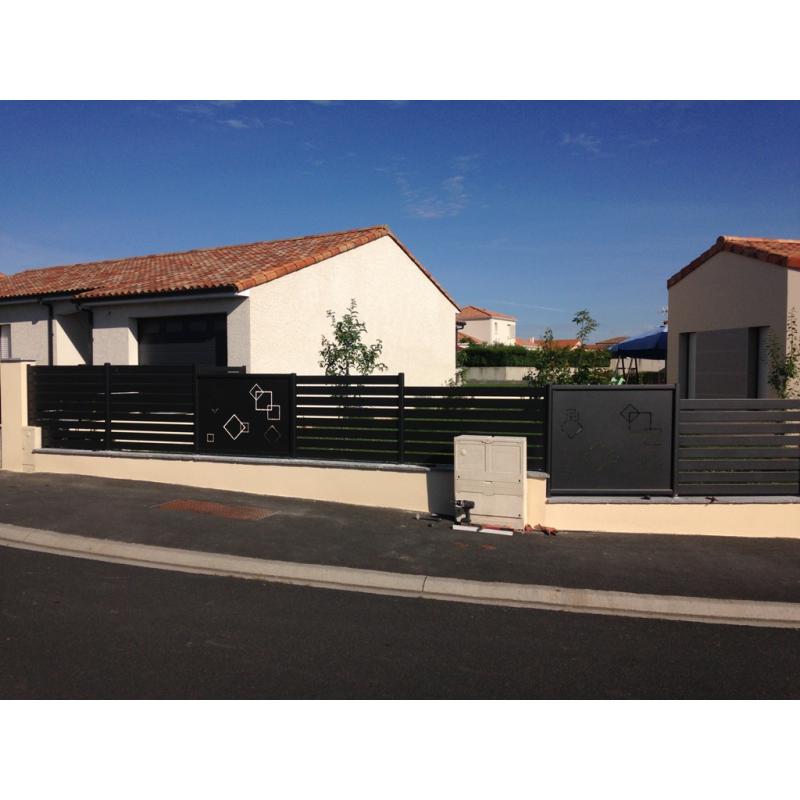 La clôture Persée est une clôture contemporaine avec un cadre de 50 x 50 mm, des poteaux de 50 x 60 mm, avec des lisses de 100 x 20 mm ou 80 x 20 mm horizontales ou verticales, avec des platines et cache platines et des barreaux de 100 x 20 mm ou 80 x 20 mm.
