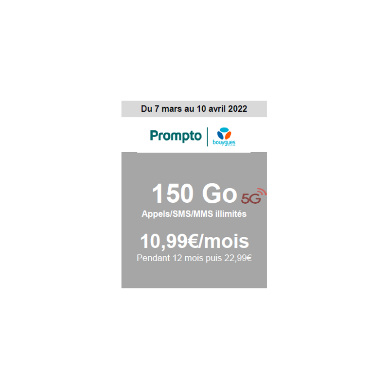 Forfait PROMPTO (sans engagement) Bouygues Telecom 150 Go en 5G 20 Go en UE/DOM, Suisse, Andorre et USA 10,99 € / mois pendant 12 mois puis 22,99 € Eligible sous condition Disponible seulement en agence