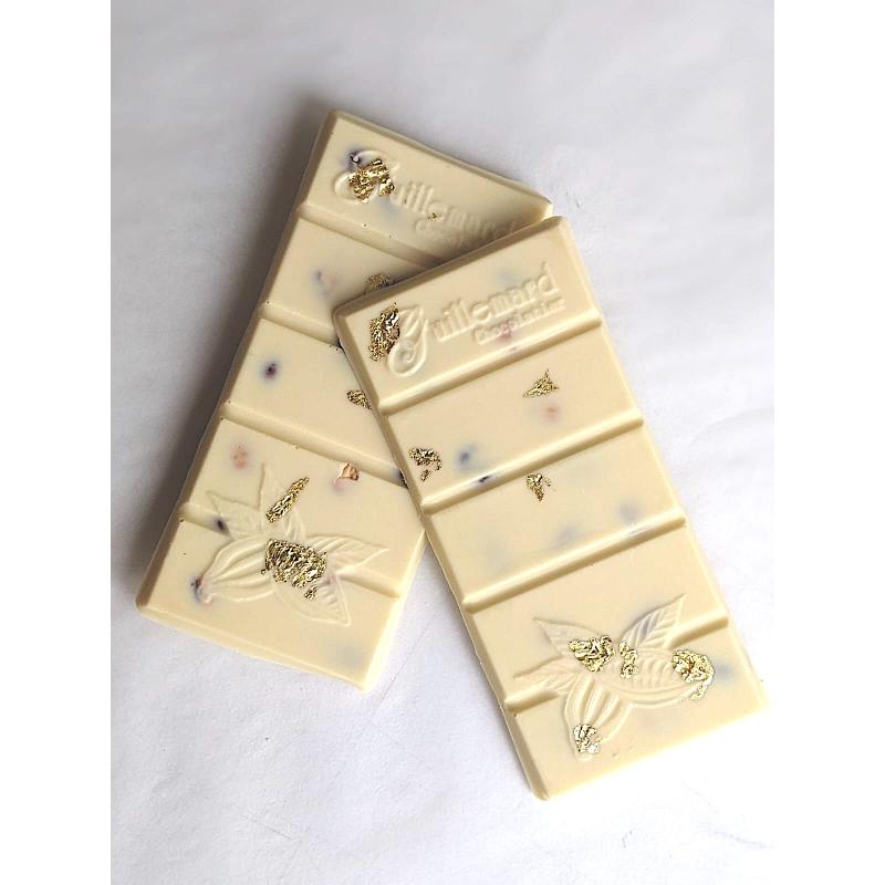 Pour fêter ses 25 ans, la chocolaterie Guillemard a créé cette magnifique tablette de chocolat blanc aux graines de vanille de Madagascar et aux amandes et noisettes torréfiées. Agrémentée avec élégance de feuilles d'or, un cadeau tout en finesse ...