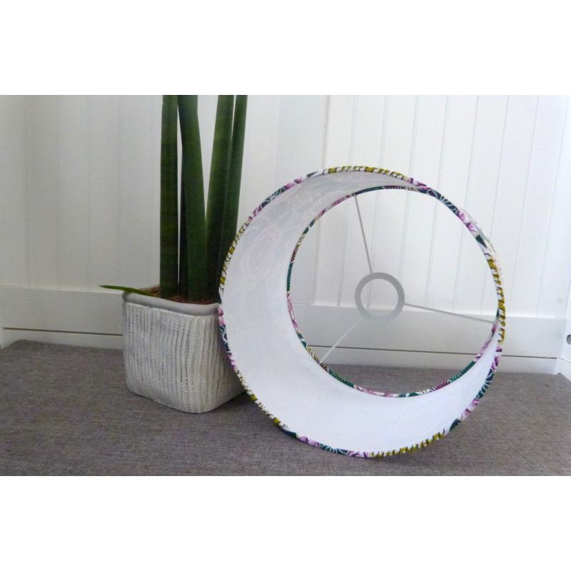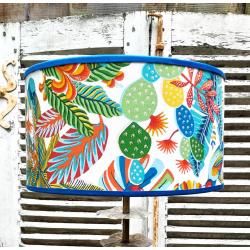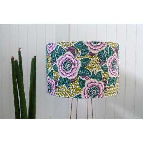 Abat-jour cylindrique en papier polyphane blanc recouvert d'un tissu imprimé Dahlia vert et rose.
