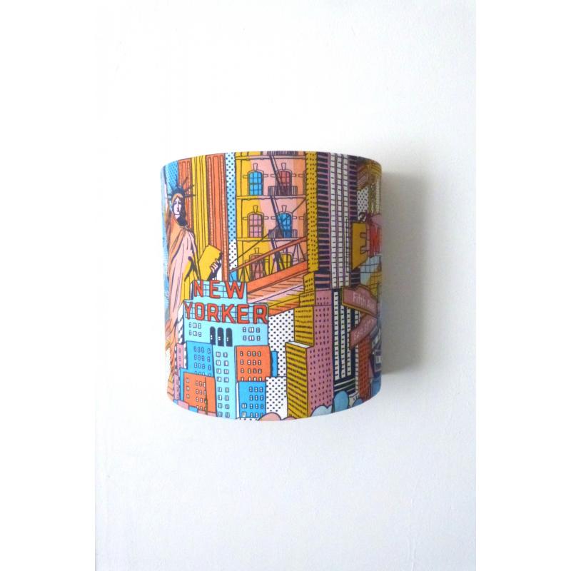 Applique murale en polyphane blanc recouvert d'un tissu d'ameublement imprimé multicolore New York.