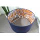Abat-jour cylindrique en papier polyphane double face : l'extérieur est en tissu bleu marine , l'intérieur est recouvert d'un tissu d'ameublement jaune safran imprimé de grandes fleurs blanches et bleues marine.