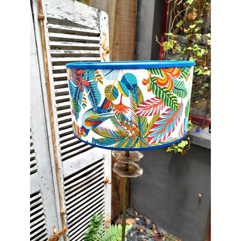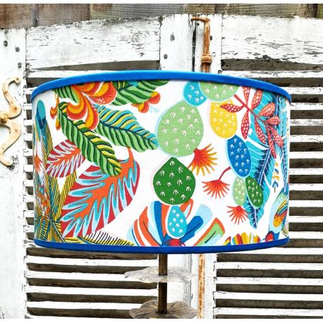 Abat-jour de forme tambour, rond, en polyphane (matière anti feu) recouvert d'un tissu ameublement imprimé jungle sur fond blanc, ourlé d'un biais bleu .