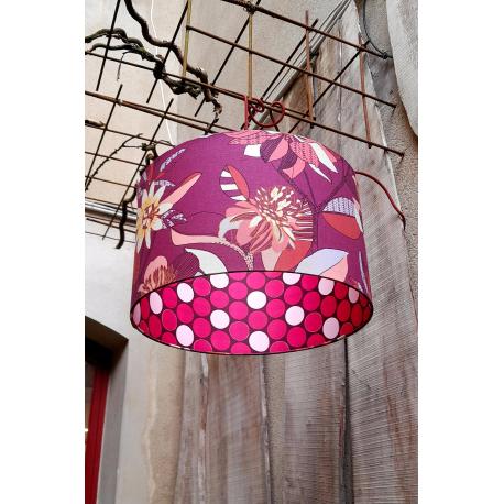 Abat- jour double tissu: extérieur fleur et branche fushia , intérieur gros pois fushia et rose.