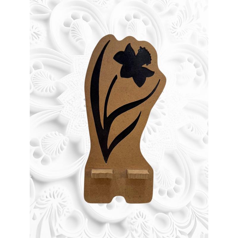 Support téléphone en bois, réalisé à partir d’un assemblage de planches et décoré d’un motif de jonquille découpé à la scie à chantourner.