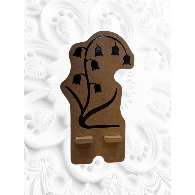 Support téléphone en bois, réalisé à partir d’un assemblage de planches et décoré d’un motif de campanule découpé à la scie à chantourner.