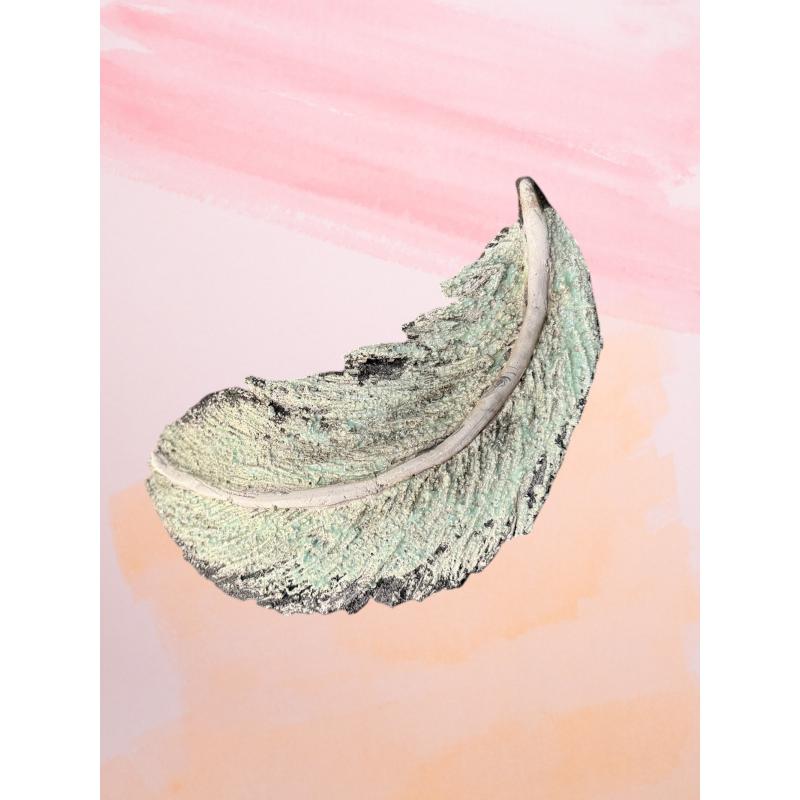 Cette plume en raku présente une allure à la fois délicate et minérale, comme un vestige poétique façonné par le feu. Sa forme courbe et élancée évoque le mouvement naturel d’une plume portée par le vent, avec une ligne centrale saillante qui rappelle la nervure duveteuse du rachis.